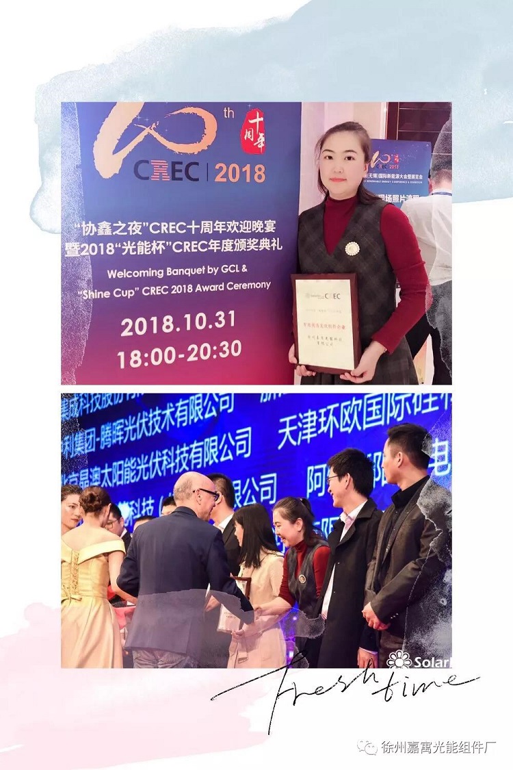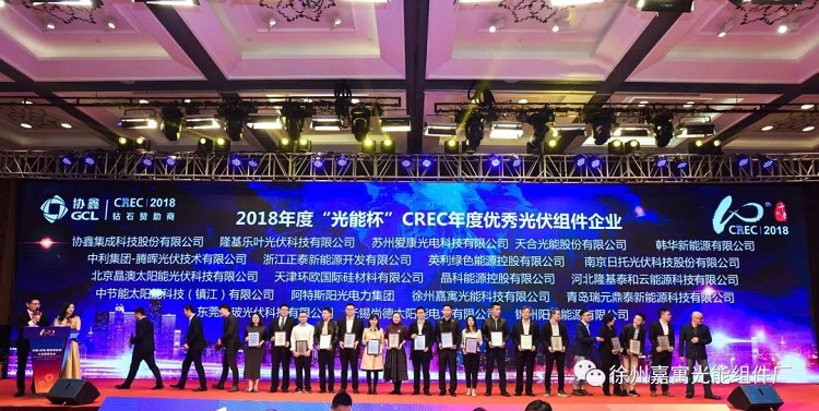 10月31日,由中國(無錫)國際新能源大會暨展覽會CREC、Solarbe索比光伏網(wǎng)、《光能》雜志共同主辦的2018CREC光能杯光伏行業(yè)頒獎晚會盛大召開,徐州嘉寓光能榮獲“年度優(yōu)秀組件企業(yè)大獎”。