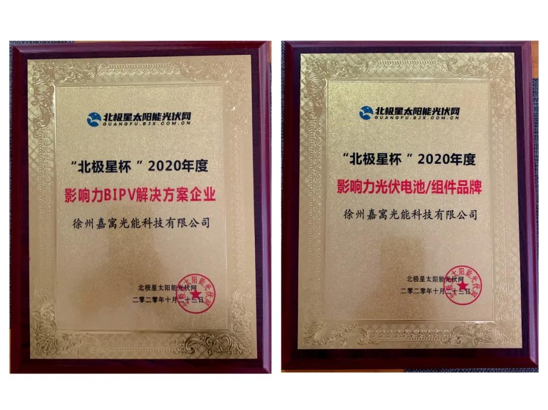2020年10月23日,“北極星杯”2020光伏影響力品牌評選活動在北京西國貿大酒店隆重舉行,嘉寓光能再次榮膺“2020影響力組件品牌”及“2020年度影響力 BIPV解決方案企業”兩個稱號。